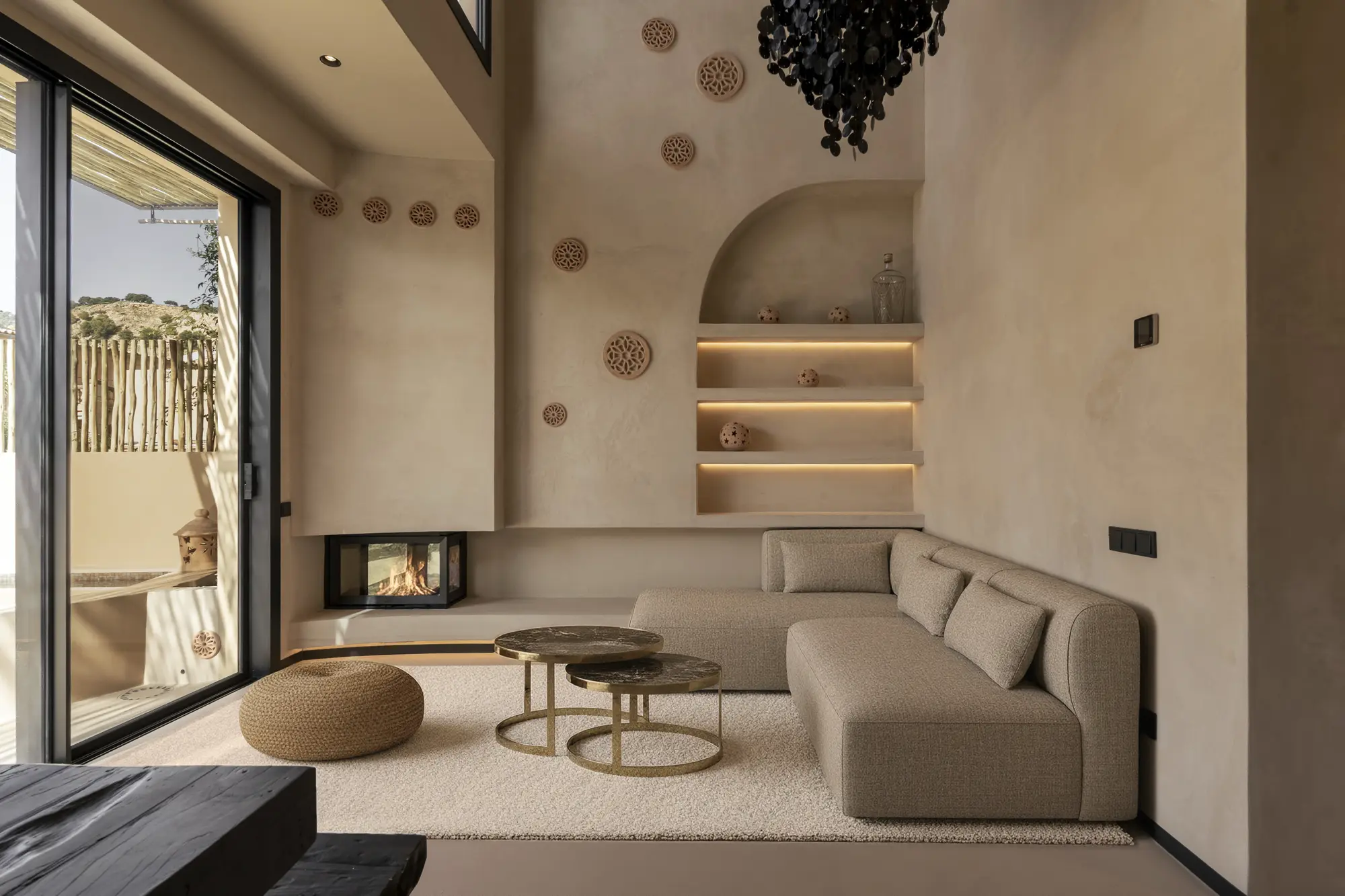 Der offene Wohnbereich mit doppelter Deckenhöhe erzeugt ein Gefühl von Offenheit und Licht und ist direkt mit der angrenzenden Terrasse verbunden, die über einen privaten Salzwasserpool verfügt. Der mit Mosaik versehene Pool mit Elektrolysesystem fügt sich auf natürliche Weise in den Außenbereich ein und bietet die perfekte Privatsphäre und Ruhe.