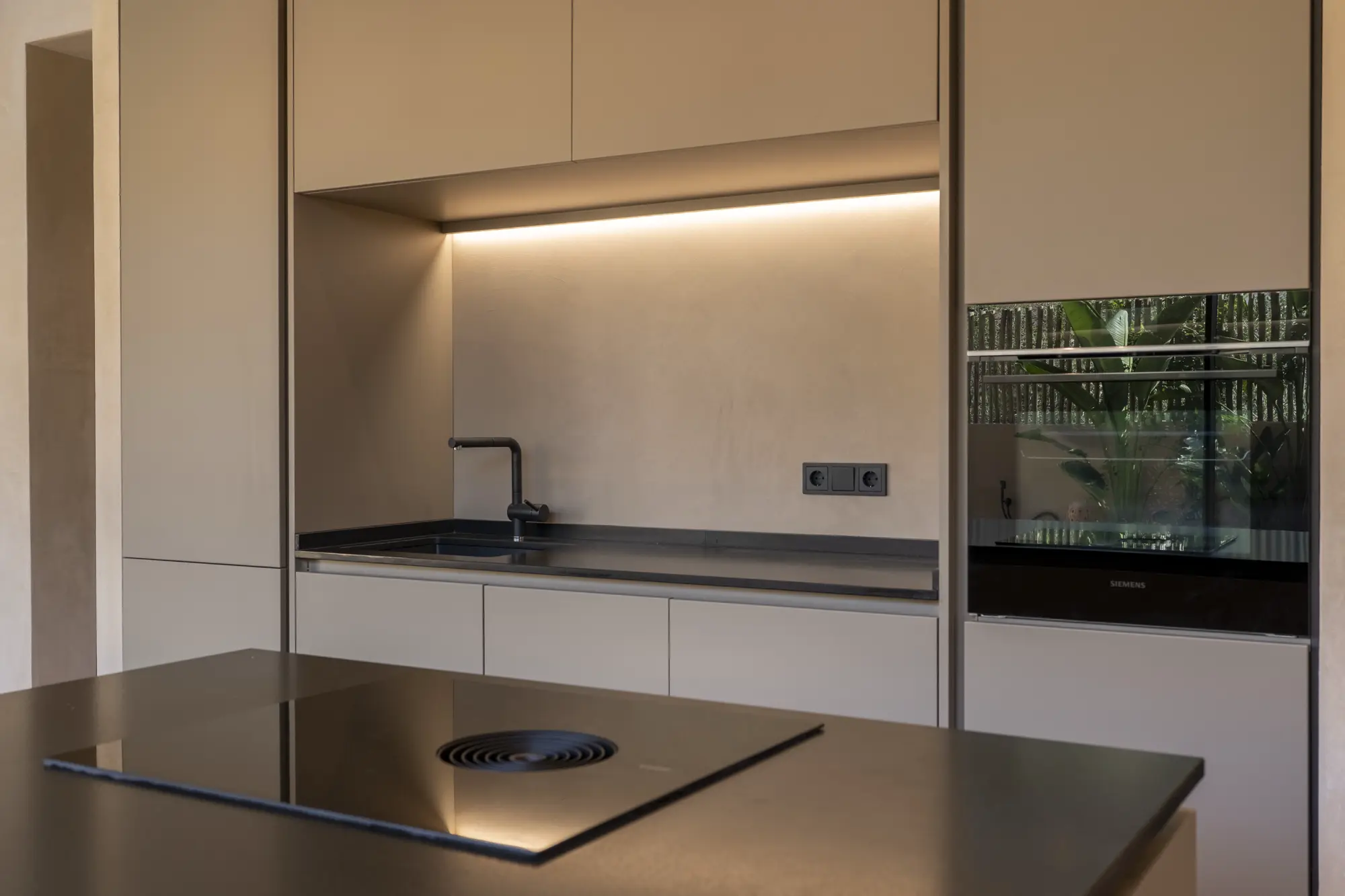 Die angrenzende und offene Gourmet-Küche ist mit Premium-Geräten der Marken Siemens und Bora ausgestattet, wodurch klare Linien und eine minimalistische Ästhetik im Design beibehalten wird.